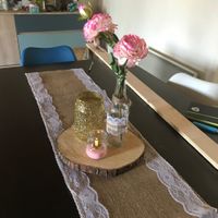Voici mes centre de table, manque juste du gypsophile dans les pots doré.