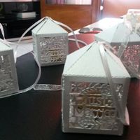 Ça y est, samedi c'était atelier montage des boîtes à dragées, 85 à monter et remplir!! Me reste encore les rubans et étiquette, tranquillou le soir devant la télé, mais ça avance... Dragées amande,...