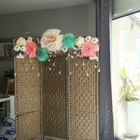 Bonsoir.Essais ce soir pour la table du cindy bar et la table de l'urne et du livre d'or. Il y aura des pompons au mur pour donner de la hauteur.Qu'en pensez vous?