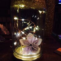 Petite partie du centre de table 🤗bocal que j'ai pailleté en doré en partie et la fleur en papier à l'intérieur que j ai réalisé hier soir 😁mais heureusement que je n'ai que 6 tables car c'est deja...