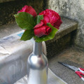 Hello!! Ce matin petit essai pour une partie de mes futurs centres de tables : une bouteille de vin, de la peinture en bombe argentée, les roses du jardin (le jour j ce sera celles du fleuriste), et...