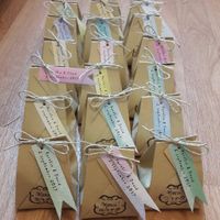 Et voilà mes petits sachets de "dragées" faits maison :-)Bon en fait il s'agit de tagada ;-)Sachets faits en origami avec du papier kraft. Étiquettes imprimées sur du bristol. Tampon pour le "carré"....