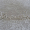 Voilà le nom de mes tables , nos prénoms pour la table d honneur et le mot "Gourmandise " pour le Candy bar le tout fait par ma créatrice de bijoux