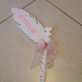 Trop fier de ma femme. Apres de multitudes idées et recherches , voilà nos noms de table. Les plumes qui rappellent notre plan de table. Le love récupèré sur des étiquettes prédécoupées. Du ruban, de...