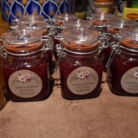 Confiture fraise pour les dames et liqueur d'abricot pour les hommes le tout fait maison. Porte alliances fait avec accessoires trouvés individuellement à la fouille.